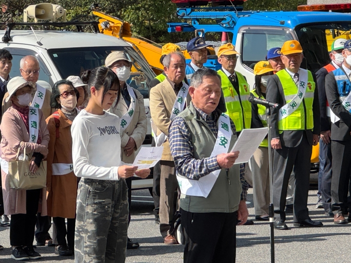 野呂幸利三重県副知事と谷井義正三重県警察本部長の挨拶の後、本会西部支部本城道子さんが交通安全啓発物品を副知事から受領しました。また、セントヨゼフ女子学園高校生徒代表とともに本会久居支部福正直さんが合同で、副知事と本部長に対して「交通安全宣言」を行いました。