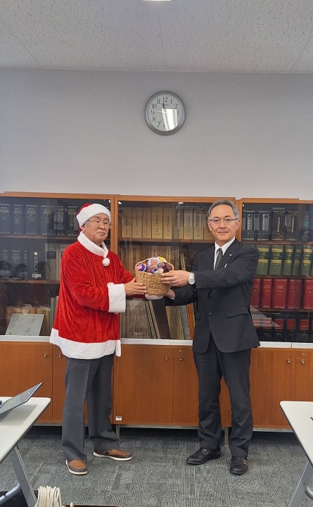 森教育長にお手玉を渡すサンタクロース姿の一見担当チーフ