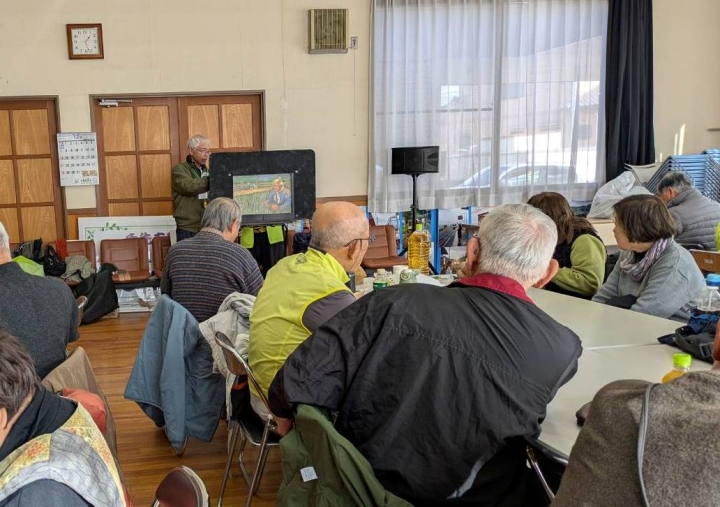 昼食は、ガイドさんの計らいで、暖かい家城公民館で取りました。食事中に、案内ガイドさんによる「寛政の一揆」の紙芝居の上演があり、200年以上も前の12月26日に、旧一志郡、旧安芸郡で起きた農民一揆の話を聞かせていただきました。
