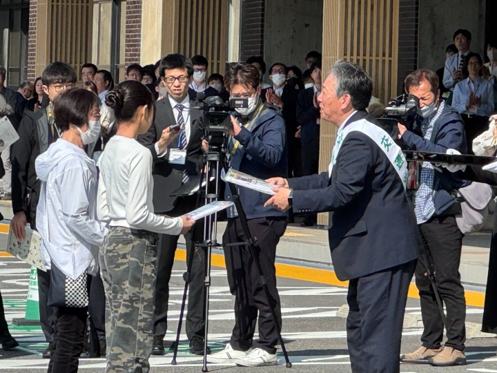 贈呈目録を読み上げる瀧代表と中島井村屋グループ社長春の全国交通安全運動出発式に参加しました。