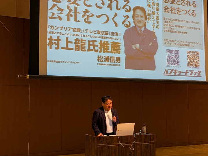 総会の後には会員研修会があり、万協製薬株式会社社長松浦信男様から「阪神淡路大震災により神戸市長田区の会社は潰れ、その再建のために奔走した。三重県の多気町に新しい社屋を建設したのは、多気町の土地を案内してもらっていた時にウグイスがターキニキョキョーッ(多気に来よー)と鳴いたので決めた」という愉快なエピソードも含めて会社再建とその後の話を披露していただきました。
