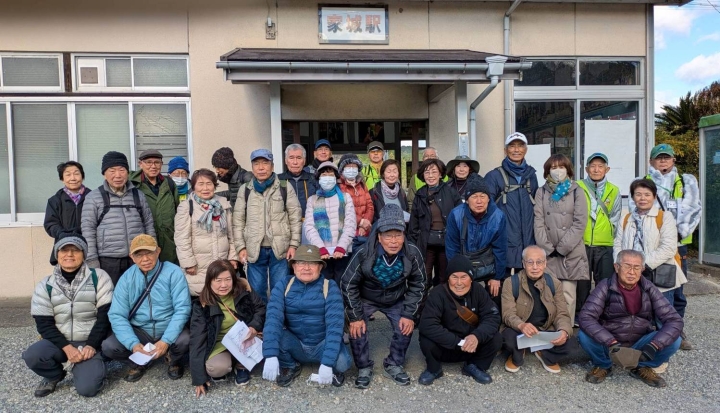 参加者27人が3グループに分かれ、「白山 道しるべの会」のガイドさんを先頭に、JR名松線家城駅前を10時30分に出発する予定でしたが、集合途中の13人もの参加者がJR一志駅で乗り遅れるという、予期せぬ出来事が発生しました。このため、車で家城駅まで来ていた方が一志駅まで迎えに行き、結局、40分遅れで家城駅前を出発することになり、一部コースを変更しての実施となりました。